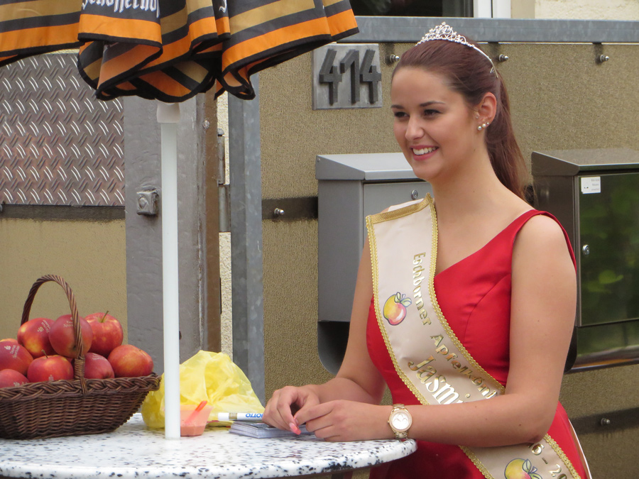 apfelkoenigin-jasminDie Abendsonne lacht und eine hübsche junge Flörsheimerin verteilt bedruckte Äpfel ihres Arbeitgebers an die fröhlichen Festbesucher. Sie trägt ein Kleid in leuchtendem Sparkassen-Rot und eine Krone ziert ihr kastanienfarbenes Haar. Die Rede ist von der Eschborner Apfelkönigin Jasmin I.